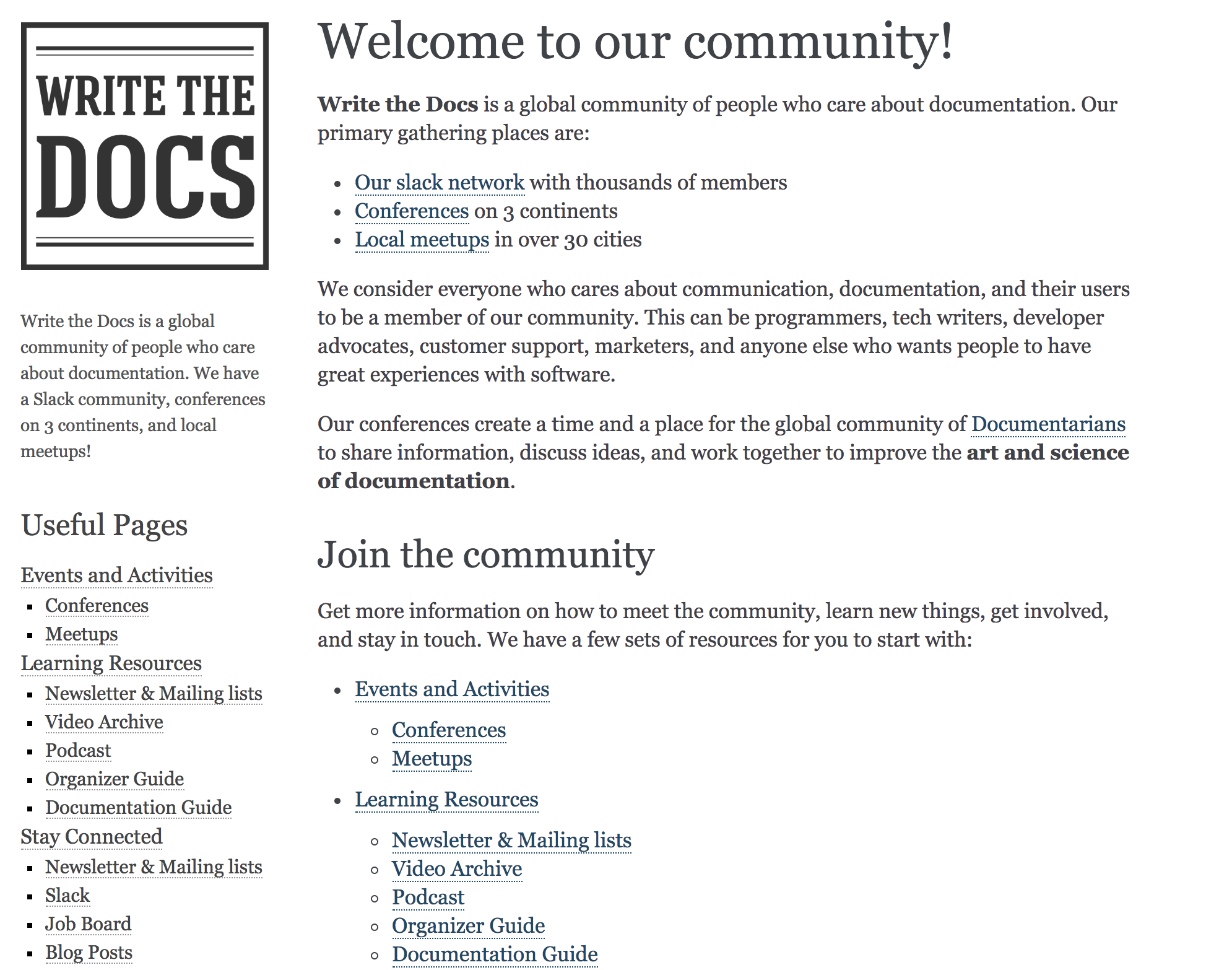 **Write the Docs** is a global community of people who care about documentation. Our primary gathering places are: